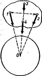 Приливные силы и кривизна пространства-времени. Если гравитационное поле неоднородно, то исключить его путем перехода к падающей системе отсчета сразу во всем пространстве или в конечной, но не очень малой области не удается. Действительно, рассмотрим, например, относительное движение в гравитационном поле Земли двух частиц, расположенных на расстоянии l друг от друга и падающих по радиусу к ее центру (рис. 1). При этом движении частицы 1 к 2 сближаются, ускорение их относительного сближения равно GMl/R3. Частицы 3 и 4 удаляются друг от друга с относительным ускорением 2GMl/R3. Это означает, что при