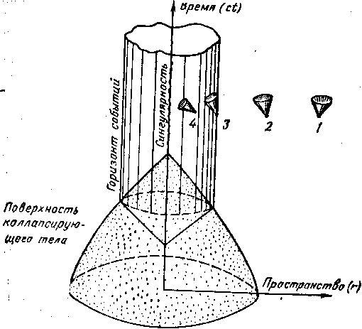 Рис. 2. Диаграмма пространства-времени при сферическом ' коллапсе. Достаточно массивное тело с течением времени : сжимается под действием сил тяготения, пересекает горизонт Событий и в конце концов сжимается в точку. Цифрами обозначены локальные световые конуса. Сигнал из точек 1 и 2 может дойти до внешнего наблюдателя, из точек 3 и 4, т. е. из-под гравитационного радиуса, не