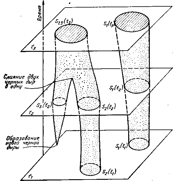 Плоскости t1, t2, t3 обозначают пространственные сечения в соответствующие моменты времени, S0(tl) — площадь черной дыры о в момент времени ti. Две черные дыры могут сливаться в одну, черные дыры могут возникать, площадь поверхности одиночной черной дыры возрастает со временем. Одна черная дыра не может распасться на две или более черных дыр. Теорема Хокинга утверждает, что общая площадь поверхностей черных дыр в момент ( является неубывающей функцией времени