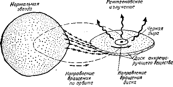 солнечных масс), то это можно рассматривать как свидетельство того, что невидимая компонента является черной дырой, поскольку маловероятно для обычной звезды с такой большой массой остаться “невидимой”, а для звезд-малюток (белых карликов и нейтронных звезд) эти массы лежат вне допустимого предела их устойчивости. Предложение использовать “невидимость” в качестве, критерия при поиске черных дыр в двойных системах было высказано в начале 60-х гг. советскими астрофизиками Я. Б. Зельдовичем и О. X. Гусейновым. Однако среди звезд, отобранных по этому признаку, черную дыру, к сожалению, обнаружить не удалось.