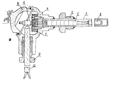 Технические ТС в зависимости от назначения и конструкции делятся на: погружаемые, поверхностные и комнатные; защищенные и не защищенные от действия агрессивной среды; стационарные и переносные; термометры 1-го, 2-го и 3-го классов точности и т. д. На (рис. 7) представлены конструкции промышленных ТС с неподвижным (а) и подвижным (б) штуцерами. Термометр состоит из чувствительного элемента 1, расположенного в защитном стальном чехле 3, на котором приварен штуцер 2 с резьбой М27х2. Провода 4, армированные фарфоровыми бусами 6, соединяют выводы чувствительного элемента с клеммной колодкой 5, находящейся в корпусе головки 7. Сверху головка закрыта крышкой 8, снизу имеется сальниковый ввод 9, через который осуществляется подвод монтажного кабеля 10. При измерении температуры сред с высоким давлением на чехол ТС устанавливается специальная защитная (монтажная) гильза 12.