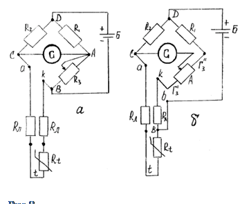 Уравновешенный мост, принципиальная схема которого приведена на (рис. 8а), используется для определения величины сопротивления при градуировке ТС и при измерениях температуры в лабораторных условиях.