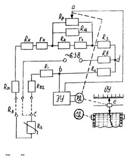 Электронный усилитель переменного тока ЭУ включен в диагональ ab и обеспечивает усиление разбаланса, возникающего в измерительной схеме при изменении сопротивления ТС Rt. Усиленный сигнал поступает на вход реверсивного двигателя РД, который вращением вала заставляет перемещаться подвижную каретку регистрирующего устройства е и движок реохорда Rр. Вращение вала происходит до тех пор, пока не наступит новое равновесие схемы; напряжение разбаланса станет равным 0, сигнал на входе РД также исчезнет и двигатель остановится.