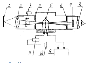 Принцип действия оптических пирометров основан на использовании зависимости плотности потока монохроматического излучения от температуры. На (рис. 11) представлена схема оптического пирометра с "исчезающей" нитью, принцип действия которого основан на сравнении яркости объекта измерения и градуированного источника излучения в определенной длине волны.