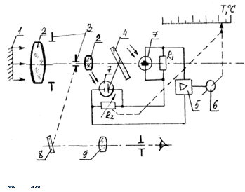 Интерференционный фильтр 4 является полупрозрачным зеркалом, имеющем высокий коэффициент пропускания в одной и высокий коэффициент отражения в другой области спектра. Зеркало 8 и окуляр 9 обеспечивают визуальную наводку объектива пирометра на объект измерения. Для уменьшения погрешности от влияния окружающей температуры фильтр 4 и приемники излучения 7 помещены в термостат.