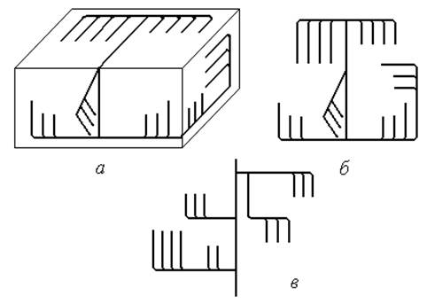 Многослойную изоляцию из различных материалов, толщина которой на чертеже 2 мм и более, штрихуют как неметаллические материалы, разделяя сплошными линиями слои. Изоляцию толщиной менее 2 мм зачерняют, разделяя слои просветами (рис. 13, б). Изоляция на видах изображается в разбежку (рис. 13, в), встык или с перекрытием (рис. 13, г).