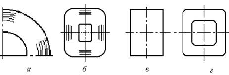 Условные изображения сердечников магнитопроводов в поперечных разрезах и сечениях определяет ГОСТ 2.416–68. Шихтованные и витые сердечники в поперечных разрезах и сечениях (относительно листов или лент) штрихуют сплошными тонкими линиями (длина штрихов и частота штриховки в соответствии с ГОСТ 2.306–68), ограничивая эти линии вспомогательными диагоналями, не показываемыми на чертеже.