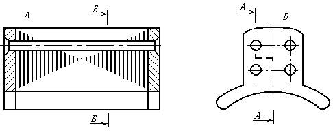Сердечники магнитопроводов в разрезах и сечениях вдоль листов не штрихуют (рис.16, в, г, разрез Б-Б на рис. 17).