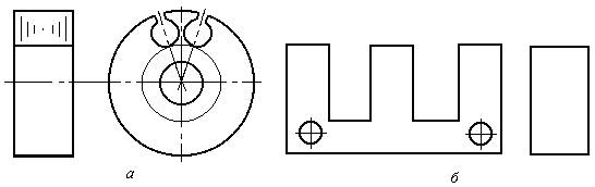 Если секущая плоскость проходит через ось сердечника якоря (ротора) или статора, то независимо от угла наклона зубца сердечника зубец условно совмещают с плоскостью чертежа и разрез (сечение) показывают по зубцу (рис. 19, а).
