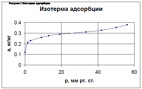 - концентрации адсорбируемого вещества в парогазовой смеси, равновесной поглощенному единицей объема количеству вещества воспользуемся изотермой адсорбции. Ввиду отсутствия необходимых табличных данных, описывающих как чувствительное полимерное покрытие, а как следствие, и отсутствие какого либо конкретного определяемого компонента, данная математическая модель ставит себе целью получение качественных характеристик описываемого ПАВ сенсора. Таким образом, за искомую изотерму адсорбции принимаем изотерму адсорбции бензола [20]. График данной изотермы приведен ниже.