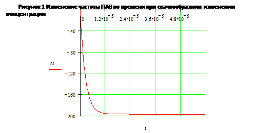 Подставляя числовые значения всех вышеперечисленных переменных в уравнение скорости адсорбции, а величину адсорбции в уравнение изменения частоты поверхностно-акустической волны и добавив к этому начальные и граничные условия получаем искомые зависимости величины адсорбции от времени и изменение частоты от времени.