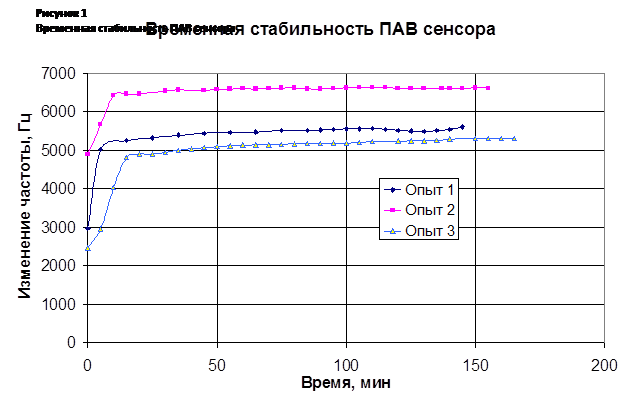 В ходе работы была проведена серия экспериментов по определению стабильности частоты ПАВ преобразователей. Для этого они закреплялись в экспериментальную ячейку, конструкция которой описана в выше. Методика проведения экспериментов заключалась в следующем. Измерения частоты производились непрерывно в течение двух с половиной часов.