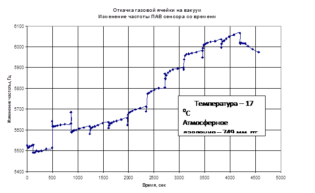 График откачки ячейки на вакуум и зависимости частоты ПАВ сенсора от времени переходных процессов показаны на рис. 18