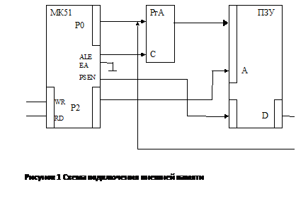 В случае использования внешней памяти программ или данных, порт 0 служит для ввода младшего байта адреса внешней памяти, а через Р2 – для вывода старшего байта вывода внешней памяти, поэтому, когда мы используем внешнюю память – эти порты заняты. Данные во внешнюю память передаются через регистр Р0 (рис. 9).