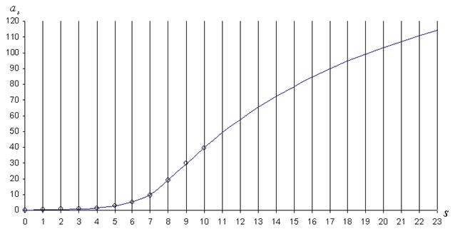 Обратим внимание, что фокус гиперболы лежит между значениями s=7 и s=8, то есть между Сатурном и Ураном, как раз на грани между планетами, видимыми невооруженным глазом, и планетами дальними, открытыми лишь относительно недавно. Кроме того, вблизи этой точки перегиба находится замечательный астероид Хирон (2060), который больше похож на планетоид, чем на осколок разрушенного небесного тела, как большинство других астероидов. Еще более интересно, что самая большая планета Солнечной системы - Юпитер, который иногда называют несостоявшейся звездой - попала почти точно в точку перегиба гиперболы (рис.2)! Не потому ли Юпитер "набрал" самый большой вес, что его орбита находится как раз на этом перегибе?