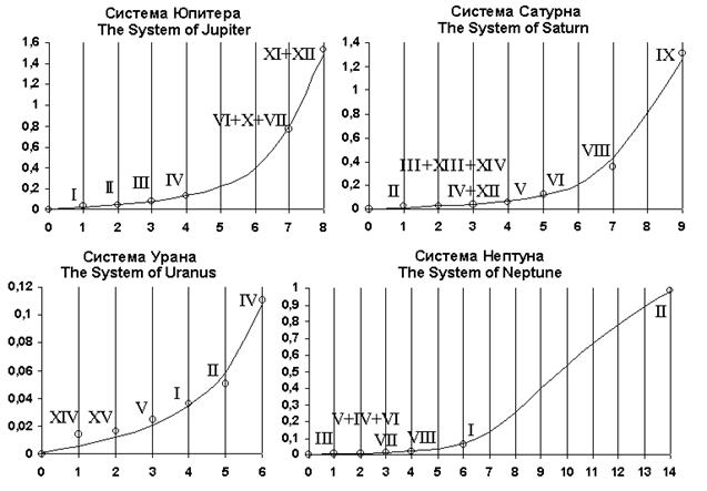 Наибольший интерес представляют системы спутников Юпитера, Сатурна, Урана и Нептуна. Скажем несколько слов о том, как проводился анализ. В первую очередь из рассмотрения пришлось исключить часть тел, имеющих неправильную форму, так как в большинстве своем они явно не укладывались ни в какую гладкую аппроксимацию. Также пришлось исключить из рассмотрения несколько весьма незначительных по размерам ближайших спутников в системах Юпитера, Сатурна и Урана. Предварительный анализ показал, что все системы спутников планет Солнечной системы хорошо аппроксимируются зависимостью (13), умноженной на поправочный коэффициент