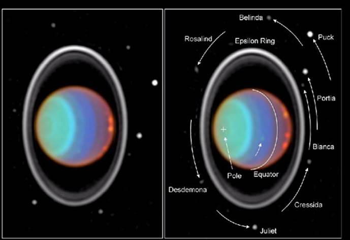 В окрестностях Урана побывал только один космический аппарат "Вояджер-2", пролетевший на расстоянии 81 200 км от внешнего покрова облаков. Траектория аппарата была почти перпендикулярна плоскости, в которой находятся спутники, поэтому с близкого расстояния удалось сфотографировать только Миранду, самый маленький из известных до этого полёта спутников. Напряжённость магнитного поля Урана оказалась больше, чем у Сатурна, а интенсивность поясов радиации такая же, как у поясов Земли. В ультрафиолетовой области спектра зарегистрировано свечение атмосферы Урана, простирающееся на 50 тыс. километров от планеты. Как и у других планет-гигантов, в атмосфере Урана обнаружены вихри, струйные течения, пятна (но их гораздо меньше), а в глубине её зарегистрированы метановые облака. Гелия оказалось в три раза меньше, чем предполагалось ранее: всего 15%. Циркуляция атмосферы происходит в высоких широтах с большей скоростью, чем у экватора. Девять колец Урана были известны ещё по наземным наблюдениям покрытий звёзд планетой. "Вояджер-2" обнаружил десятое кольцо шириной 3 км и несколько неполных колец тёмного цвета. Частицы, слагающие кольца, имеют в поперечнике около 1 м. Получены изображения пяти ранее известных спутников и десяти новых, небольших по размерам. На Обероне обнаружено несколько крупных кратеров и гора высотой около 6000 м, на Титании - многочисленные кратеры и долины. Поверхность Умбриэля очень гладкая, на ней видны кратеры и светлое пятно. Сильно кратериро-ванная поверхность Ариэля со следами различных геологических процессов напоминает спутник Сатурна Энцелад. Наиболее сложной оказалась поверхность Миранды, испещрённая бороздами, хребтами и разломами глубиной несколько километров. Такая активная тектоническая деятельность оказалась неожиданной на спутнике, диаметр которого меньше 500км. Под действием поля тяготения Урана траектория "Вояджера-2" снова изменилась, и он направился к Нептуну