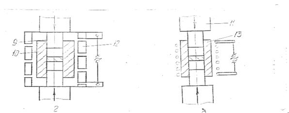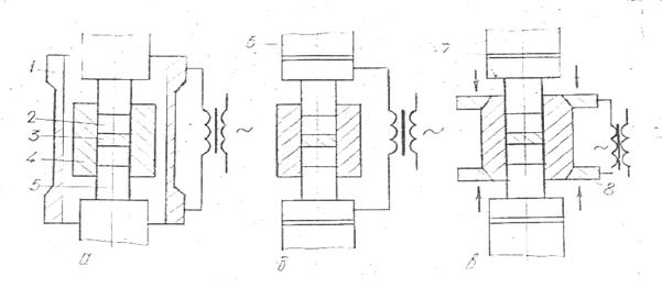 Рис. 12 Схема двухстороннего горячего прессования в прессформах : а – косвенный нагрев, б – прямой нагрев при подводе тока к пуансону, в – прямой нагрев при подводе тока к матрице, г – индукционный нагрев ТВЧ графитовой прессформы;