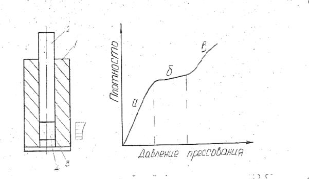 При прессовании, происходящем в закрытом объеме (рис.6) возникает сцепление частиц и получают заготовку требуемых формы и размеров. Такое изменение объема происходит в результате смещения и деформации отдельных частиц и связано с заполнением пустот между частицами порошка и заклинивания - механического сцепления частиц. У пластичных материалов деформация возникает вначале у приграничных контактных участков малой площади под действием огромных напряжений, а затем распространяется вглубь частиц.