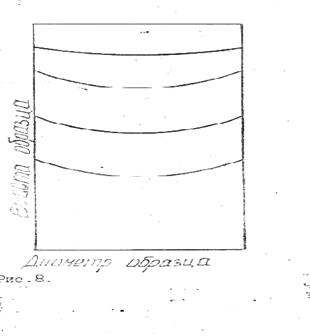 У хрупких материалов деформация проявляется в разрушении выступов частиц. Кривая процесса уплотнения частиц порошка (рис.7) имеет три характерных участка. Наиболее интенсивно плотность нарастает на участке A при относительно свободном перемещении частиц, занимающих пустоты. После этого заполнения пустот возникает горизонтальный участок B кривой, связанный с возрастанием давления и практически неизменяющейся плотностью т.е. неизменным объемом порошка. При достижении предела текучести при сжатии порошкового тела начинается деформация частиц и третья стадия процесса уплотнения (участок С! ‘ ). При перемещении частиц порошка в прессформе возникает давление порожка на стенки. Это давление меньше давления со стороны сжимающего порошок пуансона (рис.6) из-за трения между частицами и боковой стенкой прессформы и между отдельными частицами. Величина давления на боковые стенки зависит от трения между частицами, частицами и стенкой прессформы и равна 25 .40% вертикального давления пуансона. Из-за трения на боковых стенках по высоте изделия вертикальная величина давления получается неодинаковой: у пуансона наибольшей, а у нижней части – наименьшей (рис.6). По этой причине невозможно получить по высоте отпрессованной заготовки равномерную плотность. Неравномерность плотности по высоте заметна в тех случаях, когда высота больше минимального поперечного сечения. При прессовании засыпанных в цилиндрическую прессформу одинаковых доз порошка, разделенных прокладками из тонкой фольги получают отдельные слои различной формы и размера (рис.8).