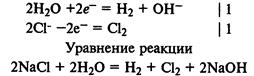 Электролиз раствора хлорида натрия. На катоде восстанавливаются молекулы воды и выделяется водород, а на аноде окисляются хлорид-ионы и выделяется хлор: