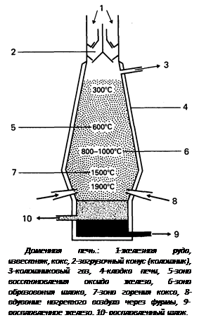 Доменная печь работает круглосуточно, в непрерывном режиме. Сырьем для доменного процесса служат железная руда, кокс и известняк. Их постоянно загружают в печь через верхнюю часть. Железо выпускают из печи четыре раза в сутки, через равные промежутки времени. Оно выливается из печи огненным потоком при температуре порядка 1500°С. Доменные печи бывают разной величины и производительности (1000-3000 т в сутки). В США существуют некоторые печи новой конструкции с четырьмя выпускными отверстиями и непрерывным выпуском расплавленного железа. Такие печи имеют производительность до 10000 т в сутки.