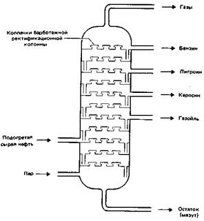 Из сырой нефти прежде всего удаляют растворенные в ней примеси газов, подвергая ее простой перегонке. Затем нефть подвергают первичной перегонке, в результате чего ее разделяют на газовую, легкую и среднюю фракции и мазут. Дальнейшая фракционная перегонка легкой и средней фракций, а также вакуумная перегонка мазута приводит к образованию большого числа фракций. В табл. 4 указаны диапазоны температур кипения и состав различных фракций нефти, а на рис. 5 изображена схема устройства первичной дистилляционной (ректификационной) колонны для перегонки нефти. Перейдем теперь к описанию свойств отдельных фракций нефти.