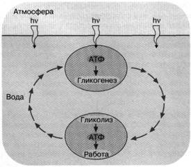 Рис. 2. Энергетика первичной живой клетки, основанная на "адениновом" фотосинтезе. Предполагается, что ультрафиолетовые кванты, достигая поверхности первичного океана, использовались клеткой для синтеза АТФ, который запускал синтез углеводородов (гликогенез). Клетка, увлекаемая потоком океанской воды с поверхности на некоторую глубину, оказывалась вне досягаемости ультрафиолетового облучения. Здесь происходило расщепление накопленных углеводов и синтез АТФ, использовавшегося для совершения клеткой различных типов полезной работы