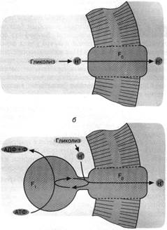 Рис. 3. Как первичная клетка могла избавиться от ионов НГ, образуемых гликолизом: а - облегченная диффузия ионов Н+ посредством белка (фактора F0), образующего Непроводящий путь сквозь клеточную мембрану; б - комплекс факторов F0 и F, (Н+ - АТФаза) активно откачивает из клетки ионы Н+ за счет гидролиза АТФ. Мембранные липиды показаны горизонтальной штриховкой, белки не заштрихованы