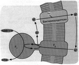 Рис. 4. Бактериородопсиновый фотосинтез со-лелюбивых архебактерий. Ионы 1-Г откачиваются из клетки бактериородопсином - белком, содержащим ретиналь в качестве хромофора, то есть группировки, поглощающей видимый свет. Ионы Н* возвращаются в клетку, двигаясь "под гору" через Н+ -АТФазный комплекс F0F,. При этом оказывается, что Н+ - АТФаза катализирует обратную реакцию, то есть синтез АТФ, а не его гидролиз