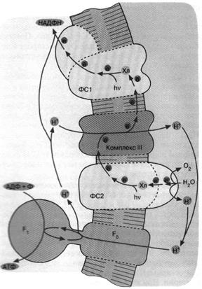 Рис. 6. Хлорофилльный фотосинтез цианобактерии. Квант света, поглощенный хлорофиллом фотосистемы 1, возбуждает перенос электронов по цепи, что завершается восстановлением НАДФ+ до НАДФН. Окисленный хлорофилл фотосистемы 1 восстанавливается комплексом III, который, в свою очередь, получает электрон от фотосистемы 2. Донирование электрона фотосистемой 2 требует еще одного кванта света (поглощаемого хлорофиллом этой фотосистемы). Потеря электрона на хлорофилле фотосистемы 2 компенсируется за счет окисления молекулы воды до О2 и Н+. Ферменты, катализирующие всю цепь реакций переноса электрона от Н2О до НАДФ*, расположены в мембране таким образом, что ионы Н+ откачиваются из бактериальной клетки, чтобы затем войти внутрь через FCF. и сделать АТФ. В хлоро-пластах зеленых растений происходят те же события, но ориентация всех ферментов противоположна той, которая имеет место у цианобактерии и показана на рис. 6. Соответственно у хлоропластов фотосинтетическая цепь накачивает ионы Н+ внутрь, а комплекс F0F, переносит их наружу