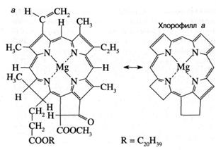 Как показано на рис. 3а, молекула хлорофилла состоит из порфиринового ядра, образованного тетрапиррольным кольцом с расположенным в центре атомом магния, и фитольного хвоста. Хлорофилл относится к классу веществ, называемых пигментами, то есть сильноокрашенных соединений, характеризующихся интенсивным поглощением видимого света. Было установлено, что система "легко возбудимых" сопряженных связей порфиринового кольца обусловливает высокую способность хлорофилла к поглощению света (рис. 36). Так, миллиметровый слой 1 мМ раствора хлорофилла поглощает около 90% падающего на него красного или синего света (зеленый свет поглощается менее эффективно, что и определяет зеленый цвет растений). Для хлорофилла, как и для других пигментов, характерно относительно длительное время, около 1(Г8 сек, нахождения в возбужденном состоянии, что важно для участия хлорофилла в фотохимических реакциях. У многих других пигментов, например, у производных хлорофилла, у которых центральный атом магния заменен на медь или марганец, это время гораздо ниже вследствие чрезвычайно быстрого перехода энергии электронного возбуждения в тепло.