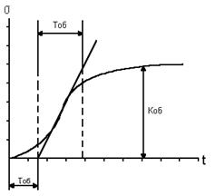 Постоянная времени объекта Тоб – это условное время, в течение которого выходная величина изменилась бы от начального до нового установившегося значения, если бы это изменение происходило со скоростью, постоянной и максимальной для данного переходного процесса. Постоянная времени характеризует инерционность объекта, под которой понимают его способность замедленно накапливать и расходовать вещество и энергию, что становится возможным благодаря наличию в составе ОР сопротивлений и емкостей, препятствующих их поступлению и выходу.