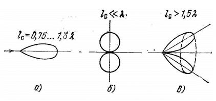 , то на одном витке спирали укладывается две, три и более волн, а это приводит к наклонному излучению и конусной форме пространственной ДН (рис. 3, в).