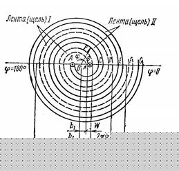 Спираль может быть двухзаходной, четырёхзаходной и т. д. Если спираль двухзаходная, то для ленты (щели) /, показанной штриховыми линиями, угол