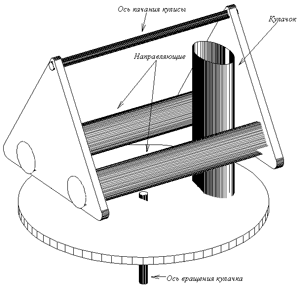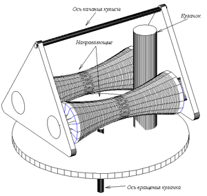 Предлагается к рассмотрению кулисно-рычажный механизм, в котором осуществляется преобразование вращательного движения кулачка в качание кулисы. Механизм может быть реализован двумя способами, как показано на рис. 1 и 2. Устройство состоит из кулачка, вращающегося вокруг постоянной оси, и кулисы с двумя направляющими. Кулиса, с жестко заделанными направляющими, качается вдоль своей оси качания, перпендикулярной оси вращения кулачка. В каждый момент времени кулачок касается обеих направляющих (каждой в одной точке) за счет выбора формы кулачка (в первом варианте) или направляющих (во втором варианте). В первом варианте (см. рис. 1) направляющие имеют форму цилиндров, а во втором варианте (см. рис. 2) кулачок выполнен в форме цилиндра.
