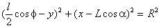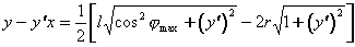 Для нахождения функции, описывающей форму направляющих для второго варианта (рис. 2), необходимо решить систему из 3-х уравнений (2.1), (2.2) и (2.3), приведенных ниже. Уравнение (2.1) определяет, что каждая точка направляющей лежит на окружности - кулачке. Дифференциальное уравнение (2.2) определяет, что в точках соприкосновения кулачка и направляющих совпадают производные, т.е. происходит касание. Уравнение (2.3) (следует из