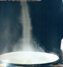 Такое течение может использоваться для разработки пылесоса без шланга и щетки, для сжатия облаков газа, пара и аэрозоля, конвективного термометра и др. В области торможения торца вихря на безграничной плоскости возникает вязкое течение в котором возможно возникновение неуравновешенной силы давления. На фотографии показана вихревая трубка на влажном паре, вращающаяся со скоростью около 10 м/с. Анализ уравнений показывает, что данный метод позволяет получать скорости вращения, соизмеримые со скоростью звука, однако реализация такой возможности требует повышенных мощностей и соответствующих мер по технике безопасности. |