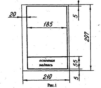 Формат с размерами сторон 841x1189 мм, площадь которого равна 1м2, и другие форматы, полученные их последовательным делением на две равные части параллельно меньшей стороне соответствующего формата, ч принимаются за основные. Меньшим обычно является формат А4 (рис.1), его размеры 210x297 мм. Чаще всего вы в учебной практике будете пользоваться именно форматом А4. При необходимости допускается применять формат А5 с размерами сторон 148x210 мм.