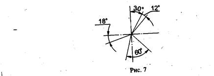 Угловые размеры наносят, как показано на рис. 7. Их указывают в градусах (°), минутах (') и секундах ("), проставляя единицы измерения, например, размер 30° на рис. 7. Размерную линию при этом проводят в виде дуги окружности с центром в вершине угла.