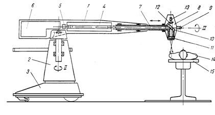 Операционный аппарат состоит из горизонтального ствола 1, установленного на вертикальной стойке 2. Ствол может поворачиваться вокруг горизонтальной оси I и вертикальной оси II.